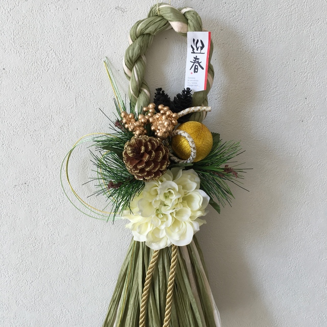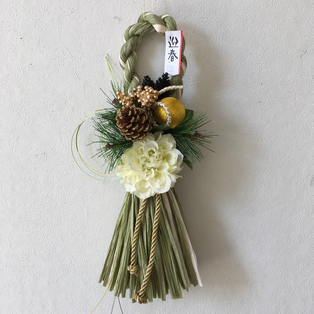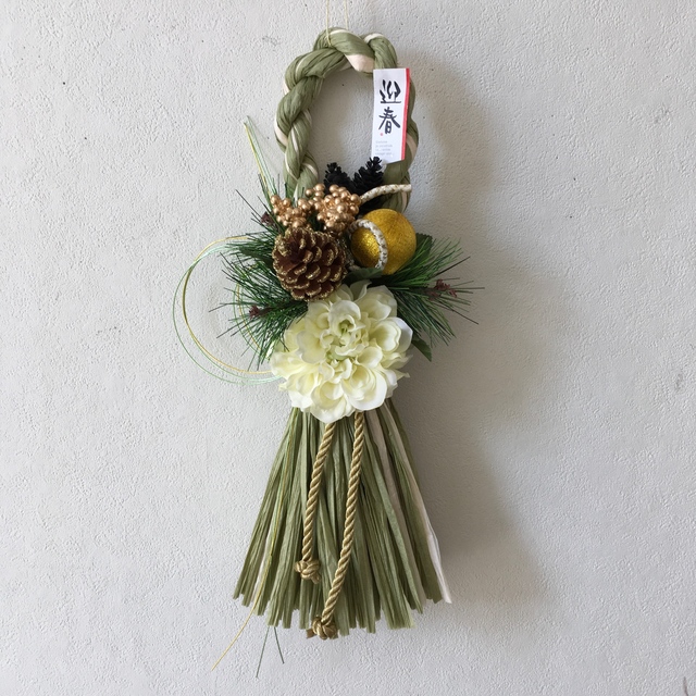 ★お正月飾り★タッソル★しめ縄飾りポンポンダリア白縦 マーブルグリーン